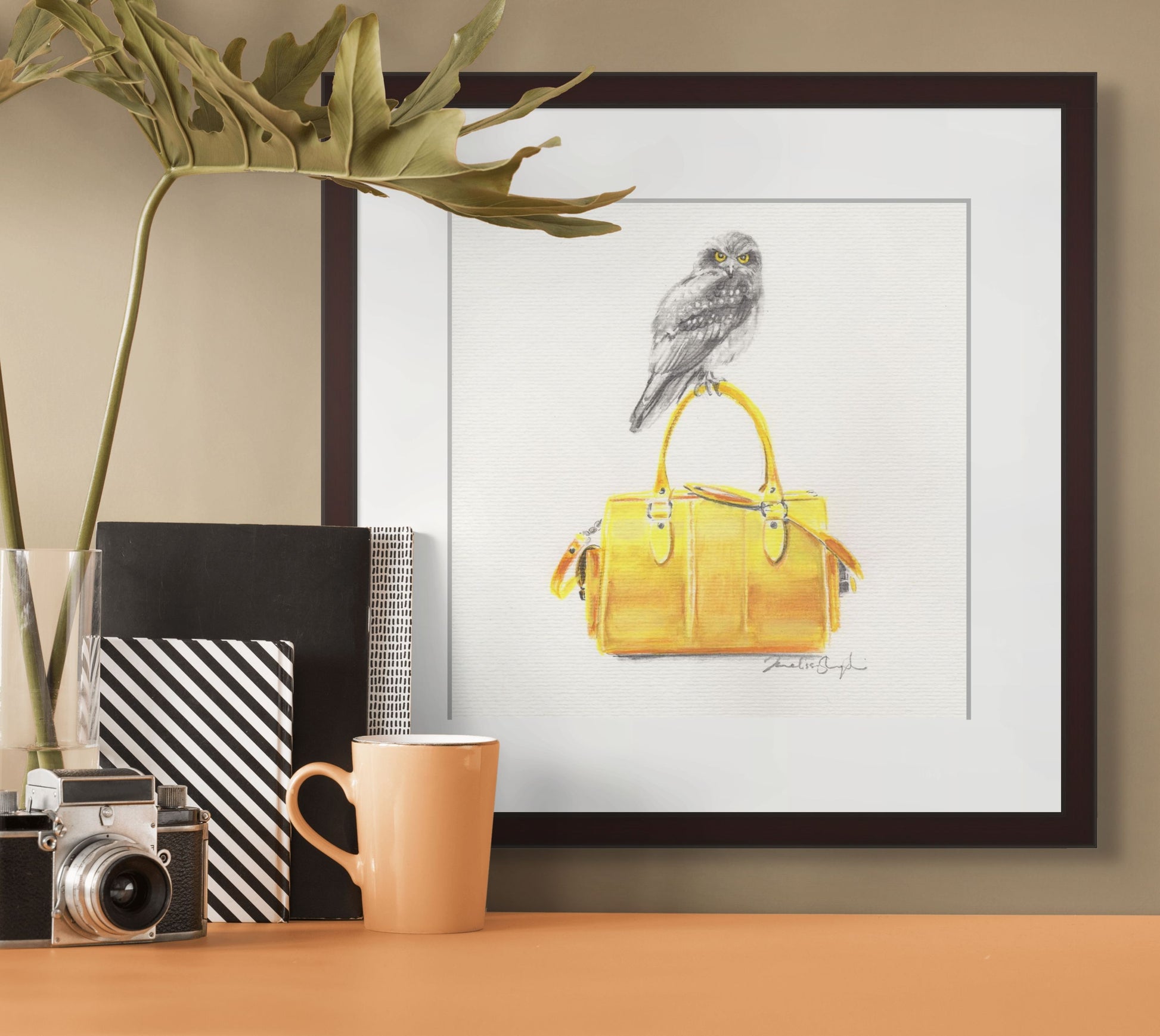 With his piercing golden eyes perfectly matching the bold yellow bag he’s perched upon, Mr Morepork brings a playful twist to a classic New Zealand native.
