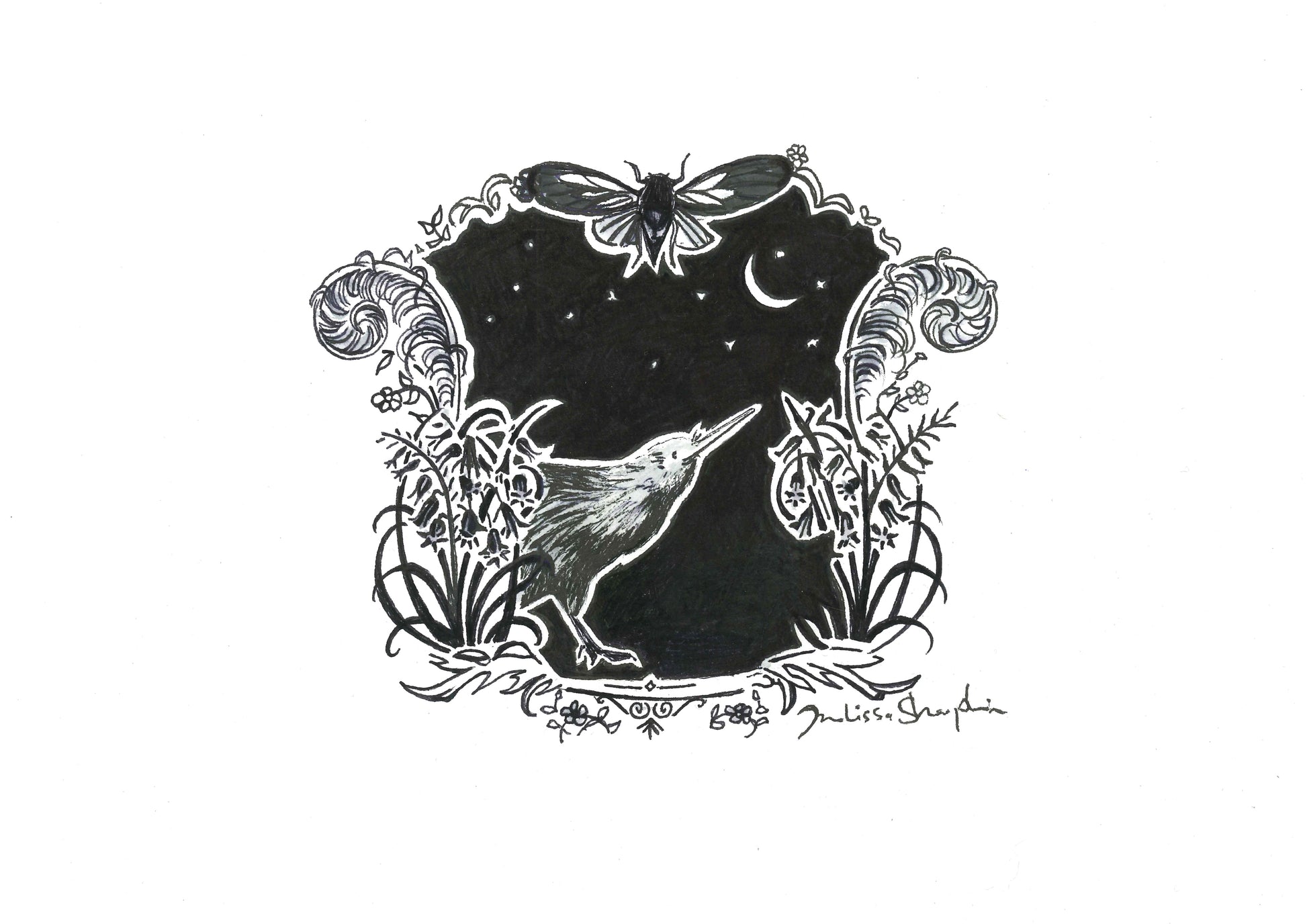 Black ink on paper — this intricate piece draws inspiration from elegant Art Deco borders and the beauty of New Zealand’s native wildlife. At its centre, a little kiwi gazes skyward beneath a starry night, framed by flourishing botanical motifs and a cicada in flight. Both nostalgic and refined, it’s a celebration of Aotearoa with a vintage twist.