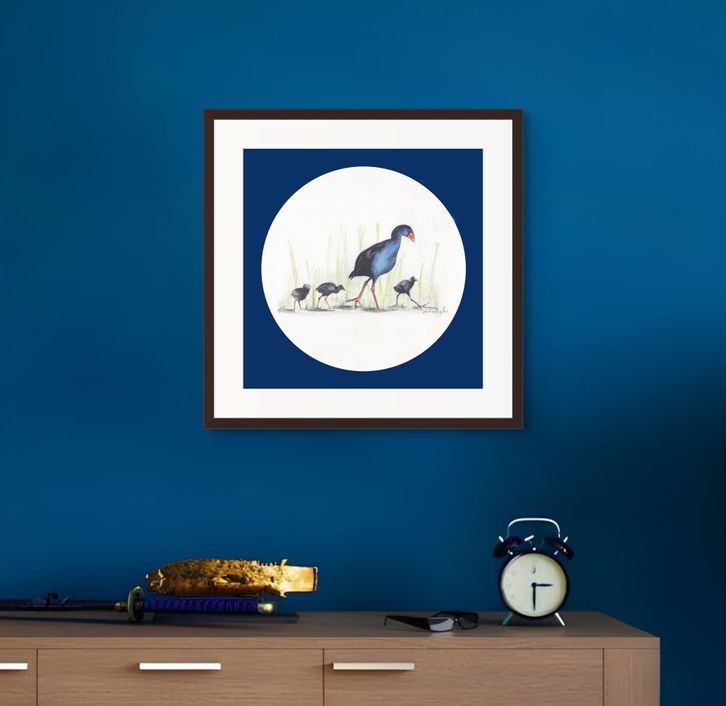 The charming, slightly goofy pūkeko are a familiar sight in New Zealand wetlands. Here, a proud mother leads her chicks in a playful parade — a reminder of the beauty, humour, and character found in our native wildlife. Available framed.